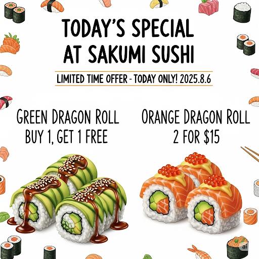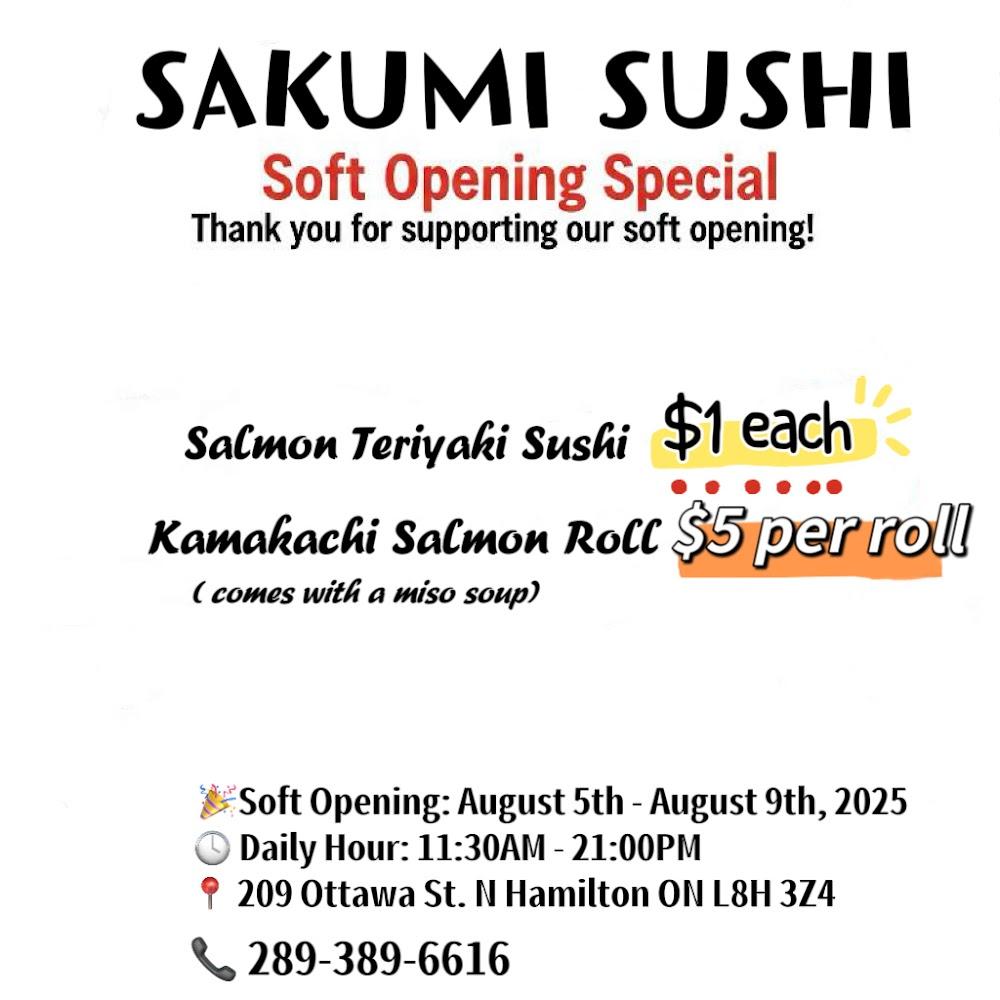 Sakumi Sushi stands at 209 Ottawa St N, Hamilton, ON L8H 3Z4, a location that's become a beacon for sushi lovers. Nestled among local shops and eateries, it blends seamlessly into the vibrant community. Open daily from 12:00 PM to 9:00 PM, this establishment embraces a warm and welcoming environment that's hard to resist. Walk-ins are welcome, and the friendly staff are always eager to share their recommendations. The restaurant's focus on quality shines through not just in the food, but in the atmosphere that encourages patrons to enjoy a meal with friends or take a moment to relax. Given its central location, it's an easy stop for lunch or dinner while exploring the area. Sakumi provides a variety of dining options, including vegan and vegetarian offerings, making it a great choice for different dietary preferences. With its community-oriented approach and commitment to quality, Sakumi has quickly established itself as a favorite among locals.